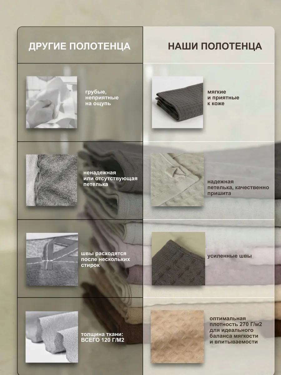 Вафельная структура ткани эффективно впитывает воду, не оставляет разводов и быстро высыхает. Полотенца лёгкие, компактные и не занимают много места.