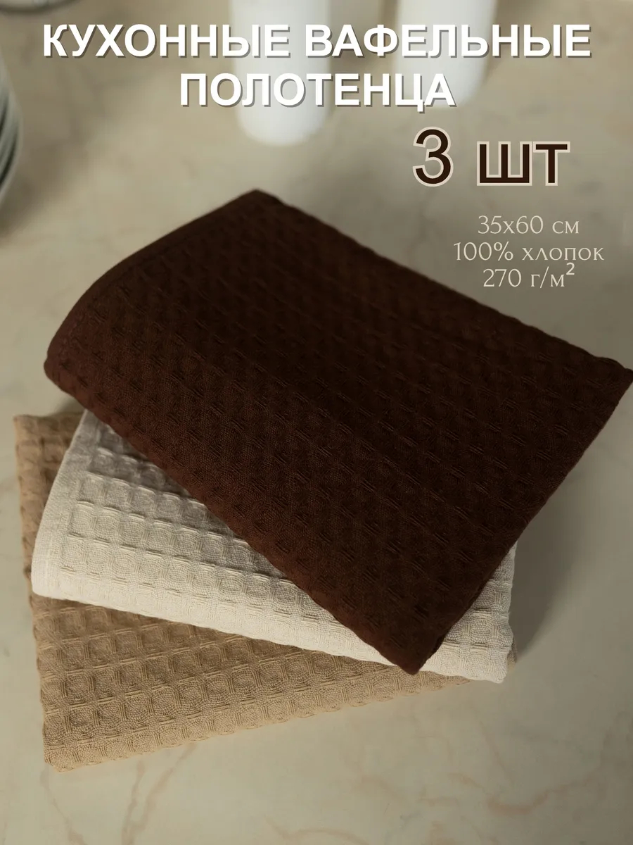 Кухонные полотенца вафельные 35×60 см, набор 3 шт, 100% хлопок, плотность 270 г/м²